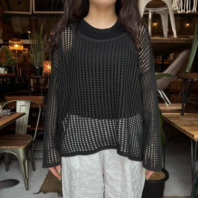 ゆったりとした透かし編のメッシュニットプルオーバー。