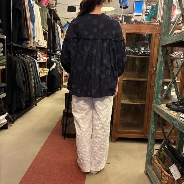 UNIVERSAL TISSU ユニヴァーサルティシュ 東炊きドットジャガードバンドカラーブラウス ネイビー×クロドット シャツ 羽織 コットン リネン