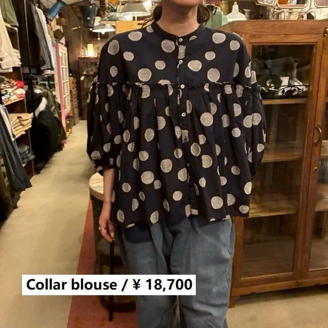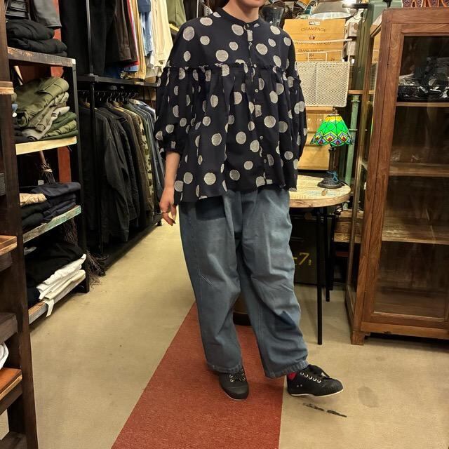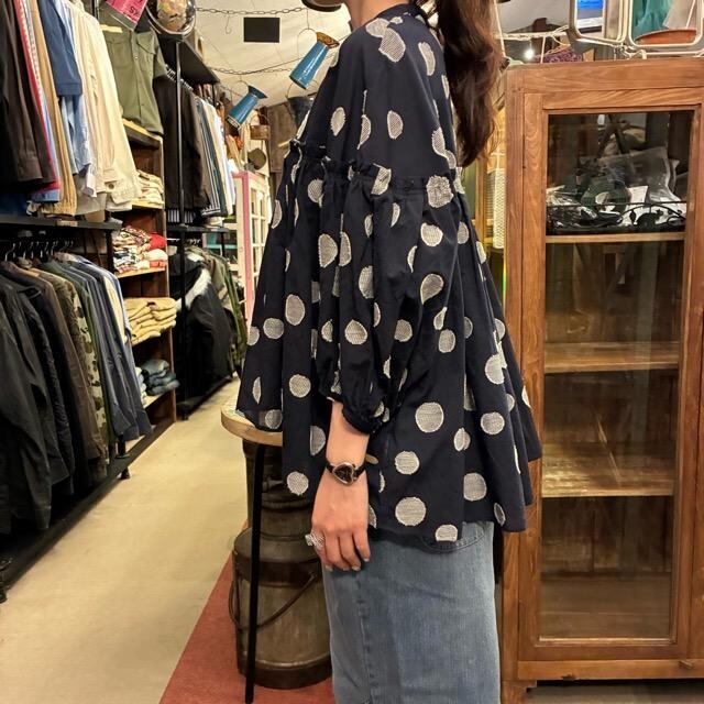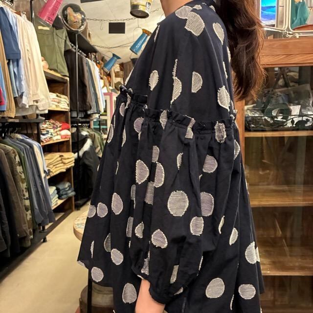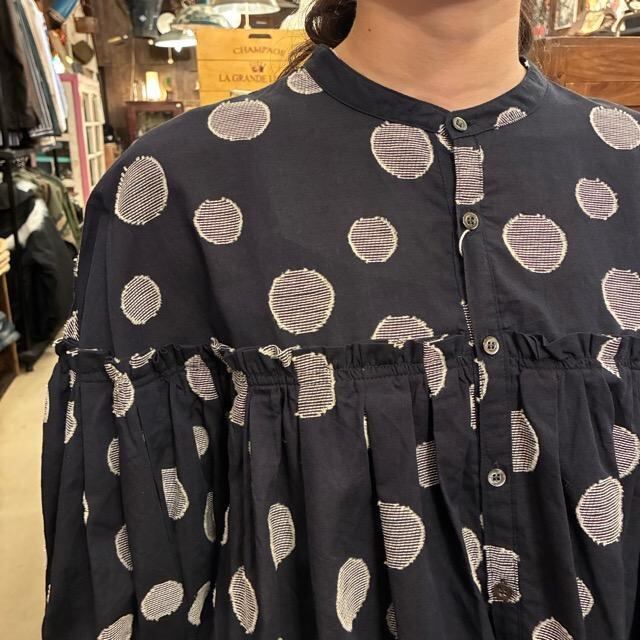 UNIVERSAL TISSU ユニヴァーサルティシュ 東炊きドットジャガードバンドカラーブラウス クロ×シロドット シャツ 羽織 コットン リネン