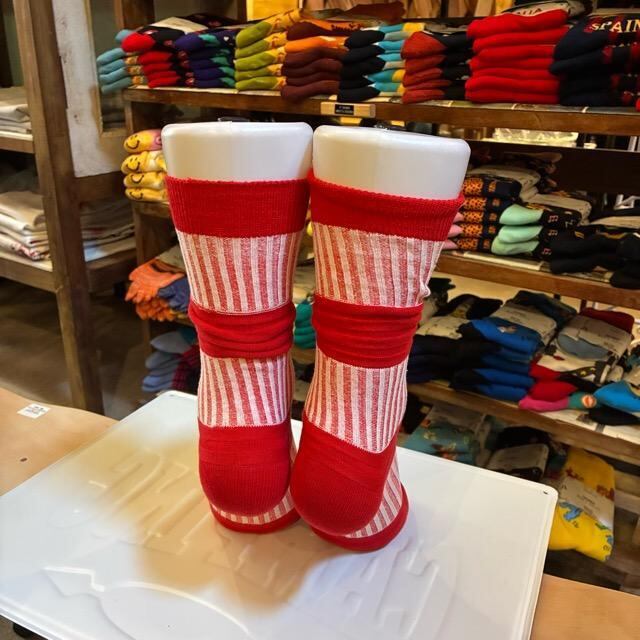 縦ストライプ、横ボーダー。交互に織られた不思議なソックス。
