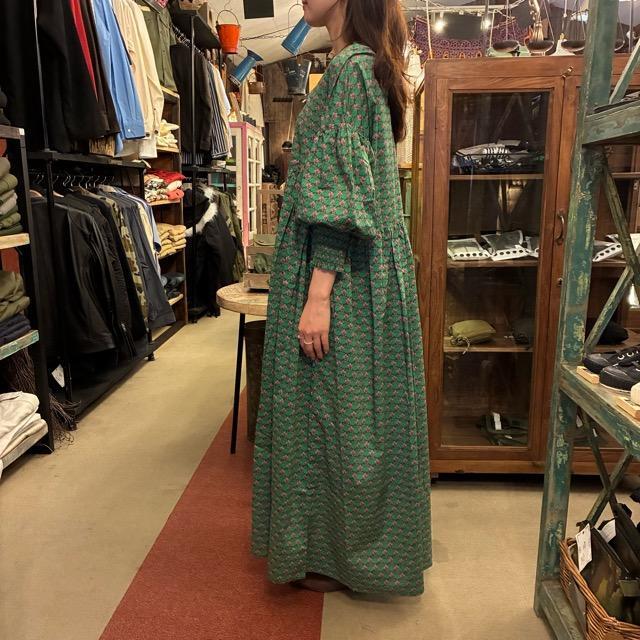 UNIVERSAL TISSU ユニヴァーサルティシュ コットンリバティプリントVネックワンピース グリーンプリント ロング UNIVERSAL TISSU ドレス 日本製
