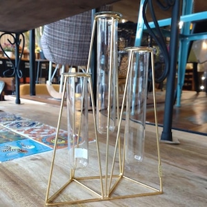 ゴールドのフレームとガラス管を組み合わせたスタイリッシュなフラワーベース。
