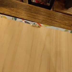 キャンバスプリントの絵をウッドフレームに貼り留めています。
