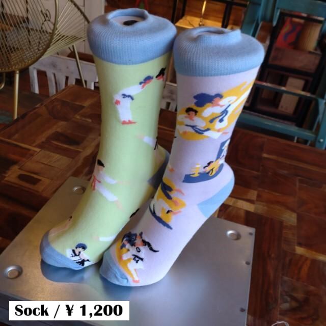 個性豊かなソックスなどの小物を合わせるスタイルを提案しています。