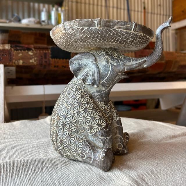 座ったポーズのゾウが、頭にカゴを載せているようなデザインのトレイです。