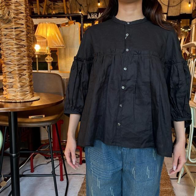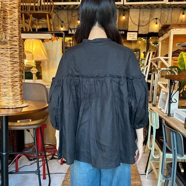 UNIVERSAL TISSU Band Collar Gathered Volume Blouse, Black, French Linen, Long Sleeve Blouse with Balloon Sleeves
