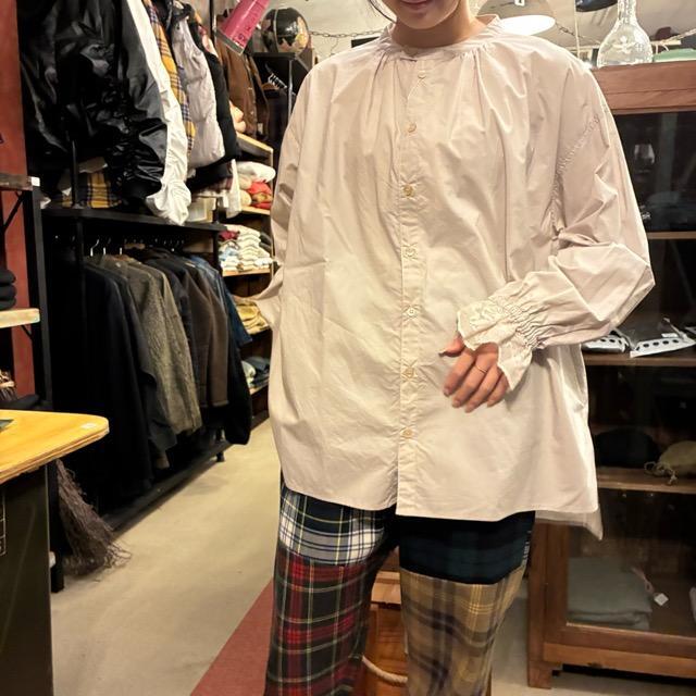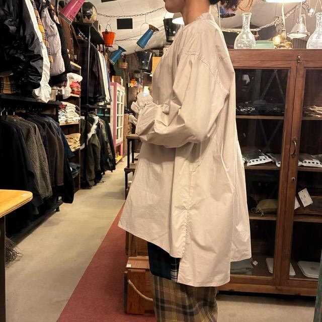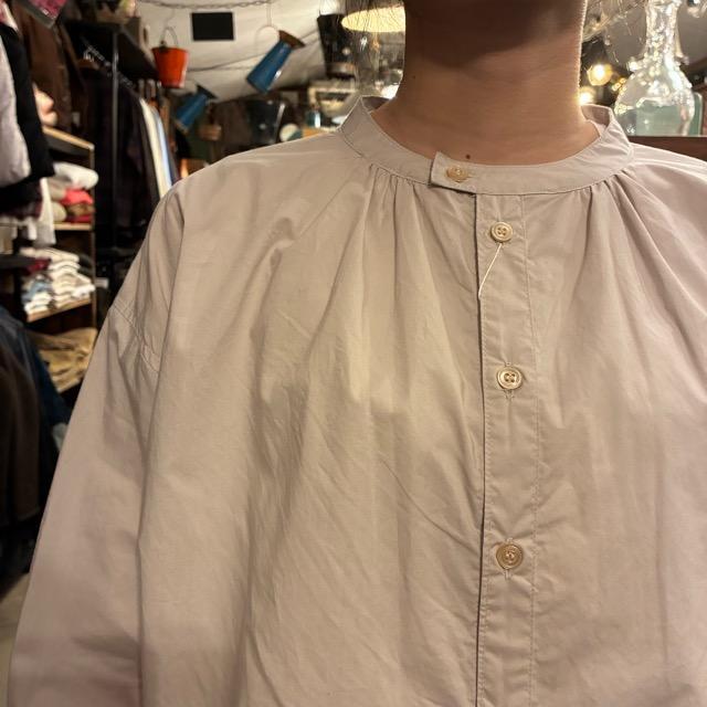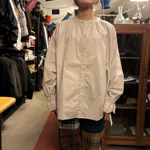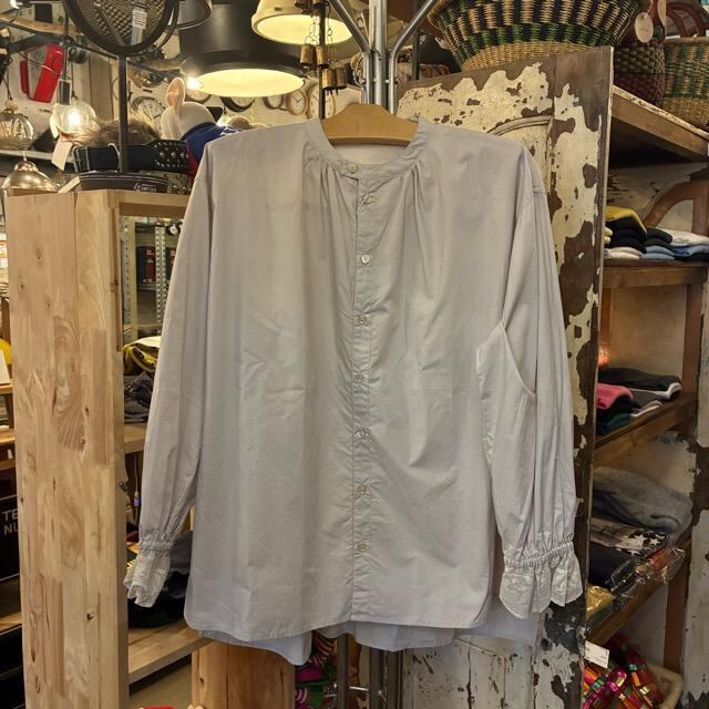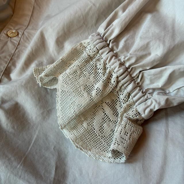 UNIVERSAL SEVEN Natural Typewriter Italian Filet Lace Stand Collar Shirt, Greige, Long Sleeve, Cotton Blouse