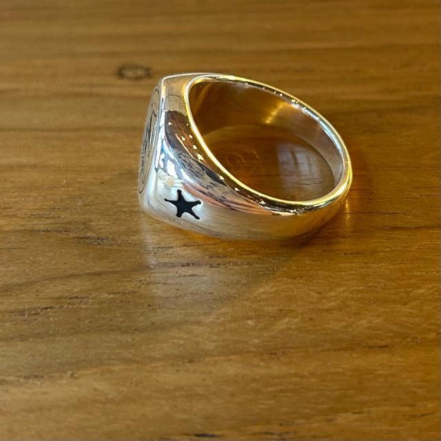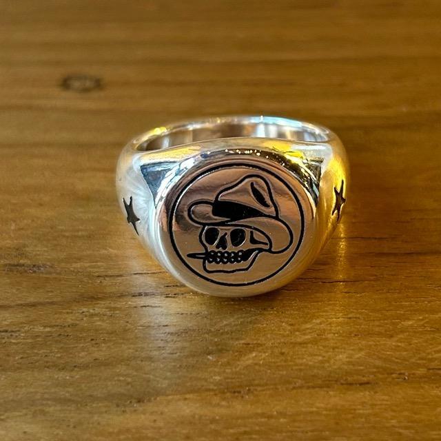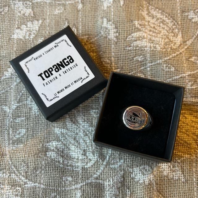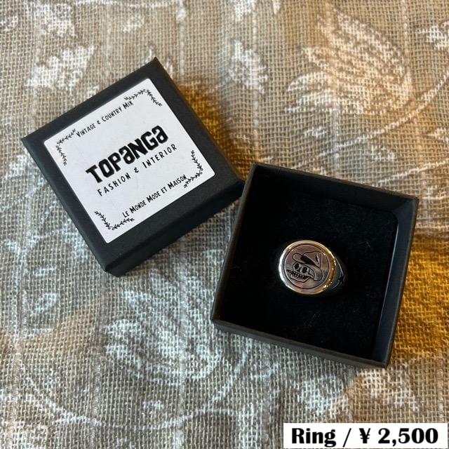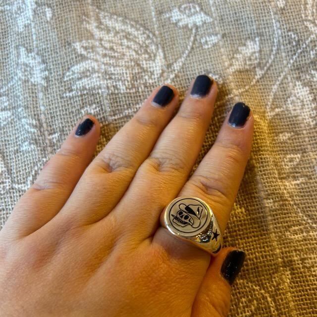 かっこいい帽子をおしゃれにかぶっている骸骨が描かれたリングです。