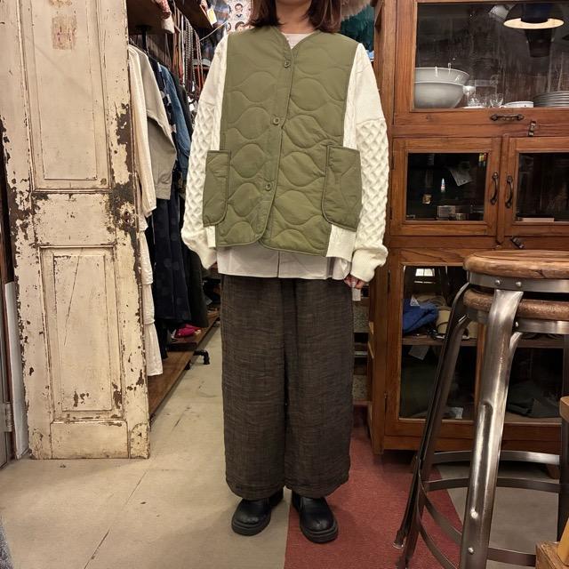 ミリタリーカラーのキルティングベストと