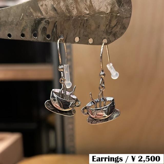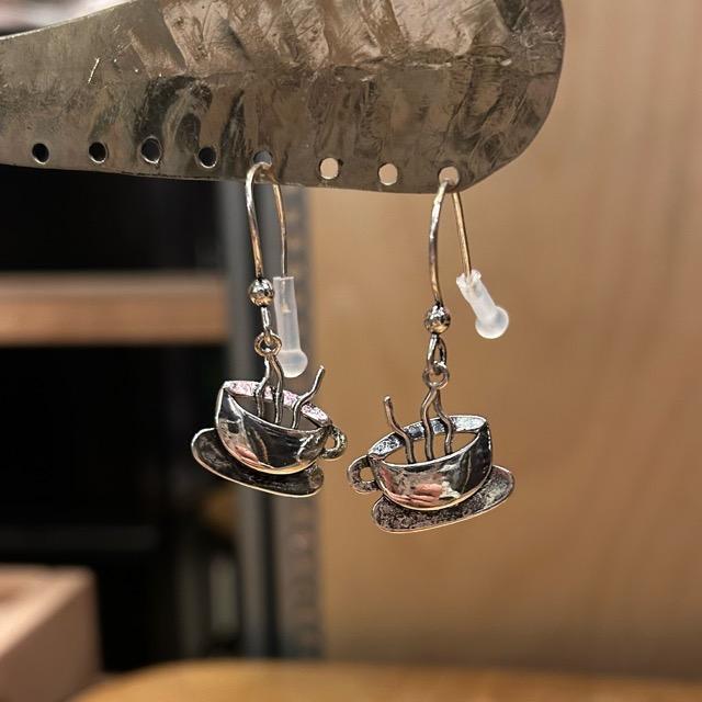 湯気が出ているのがなんとも面白いティーカップ型のピアスです。