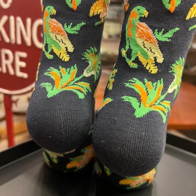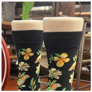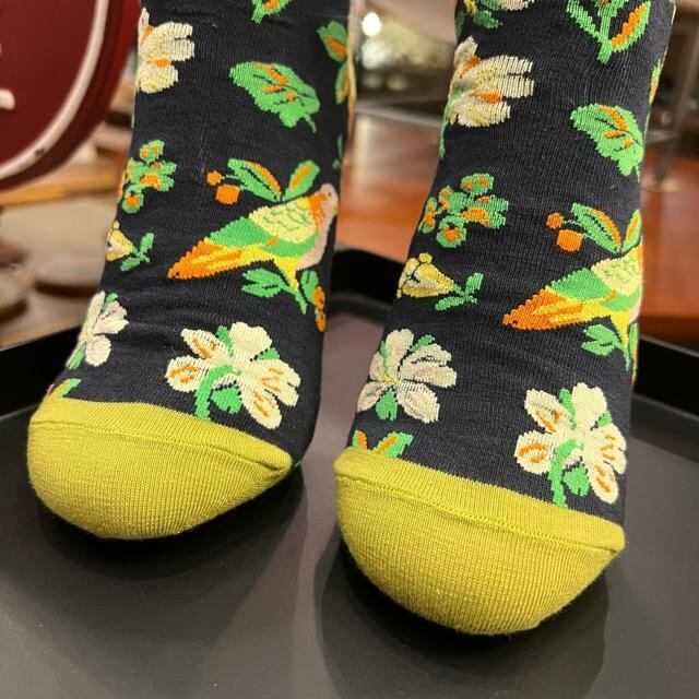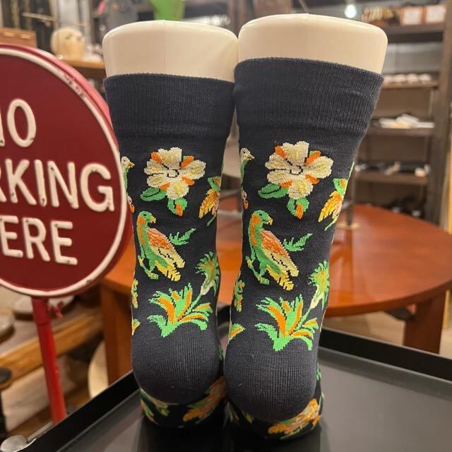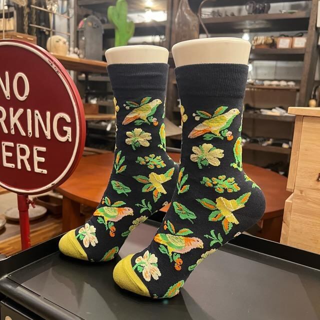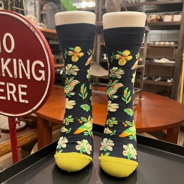シックなカラーをベースに、色鮮やかな鳥や花が散りばめられた自然モチーフが目を引くボタニカルデザインのソックスです。
