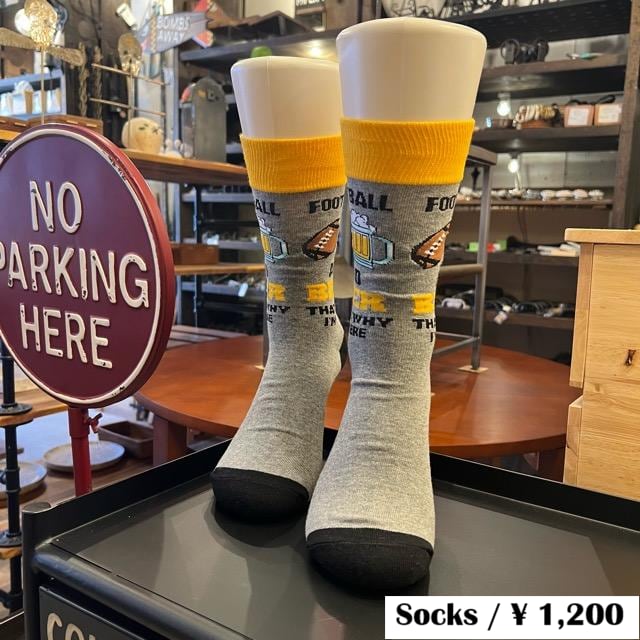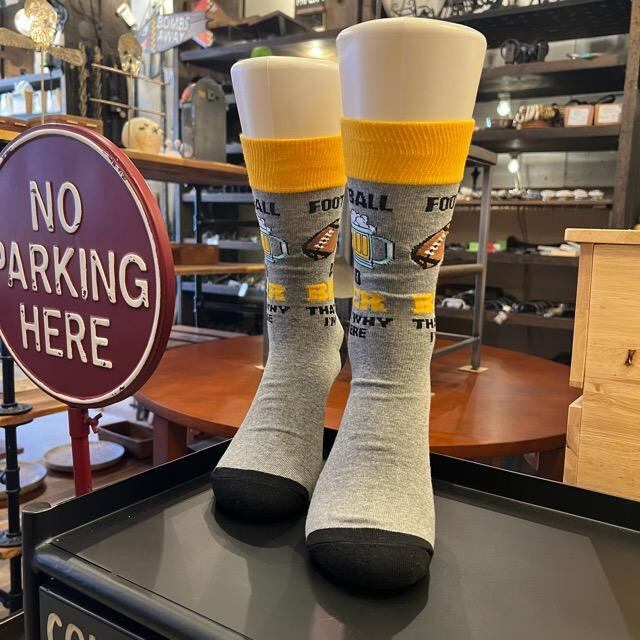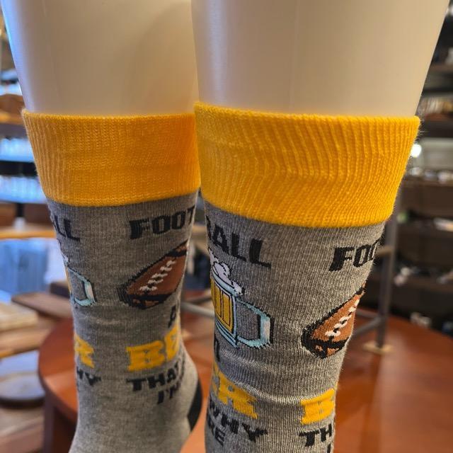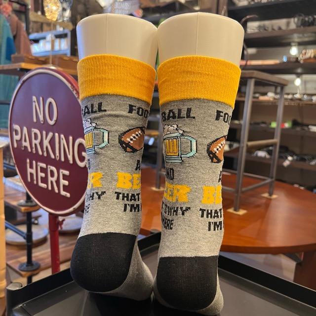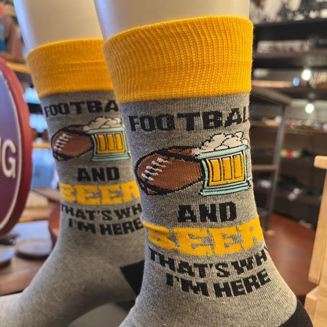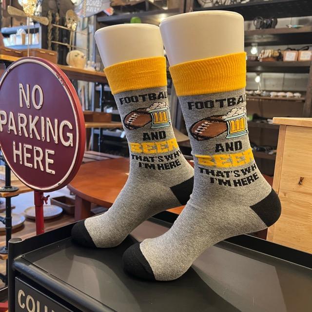 アメフトボールとビールのイラスト、そして「FOOTBALL AND BEER THAT’S WHY I’M HERE(フットボールとビール、それがここにいる理由)」のユーモラスなメッセージが書かれているデザインソックス。