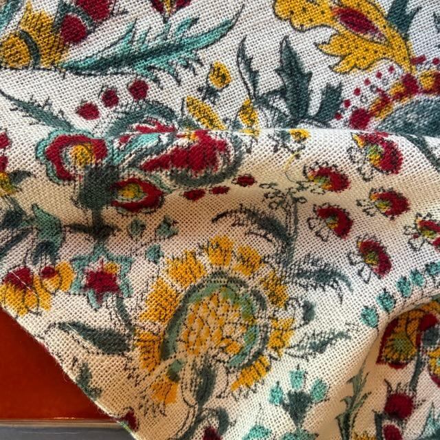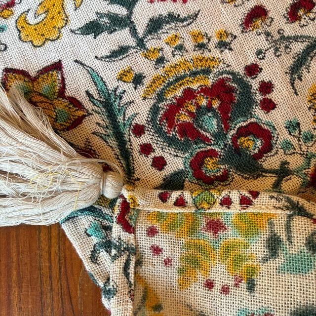 ハンドブロックプリントを施した温かみのある色あいのテーブルクロス。