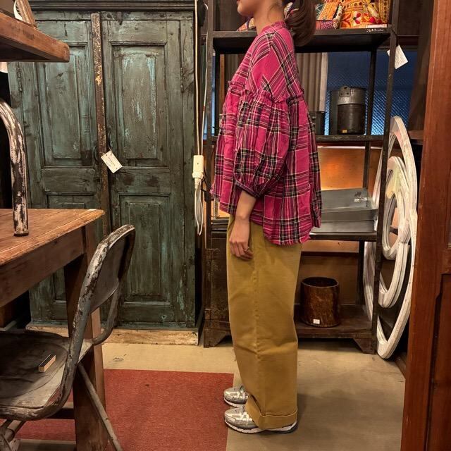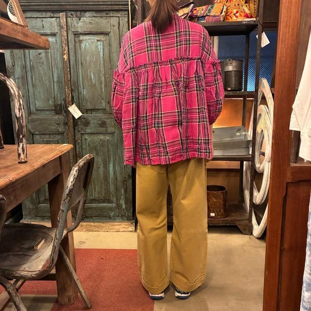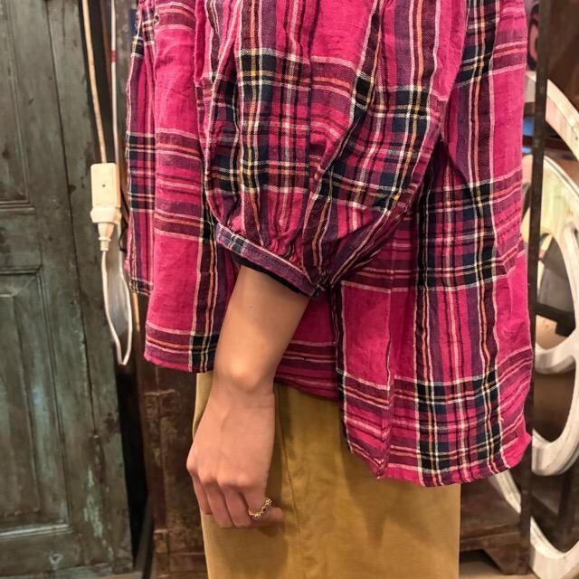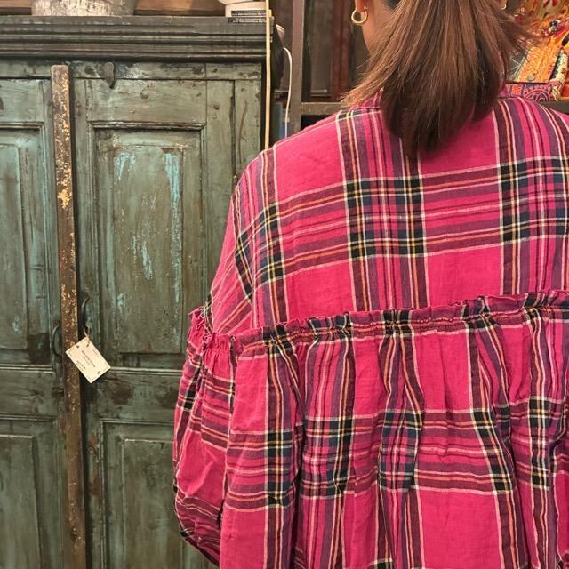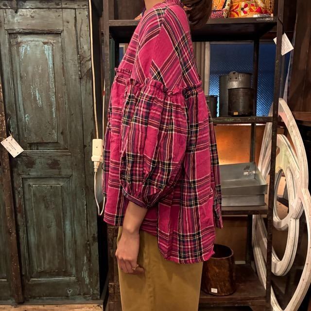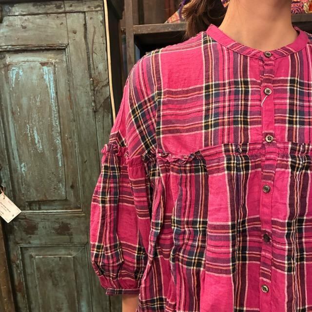UNIVERSAL TISSU East-cooked Linen Tartan Check Band Collar Blouse, Pink Tartan, Shirt, Haori, Cotton, Linen