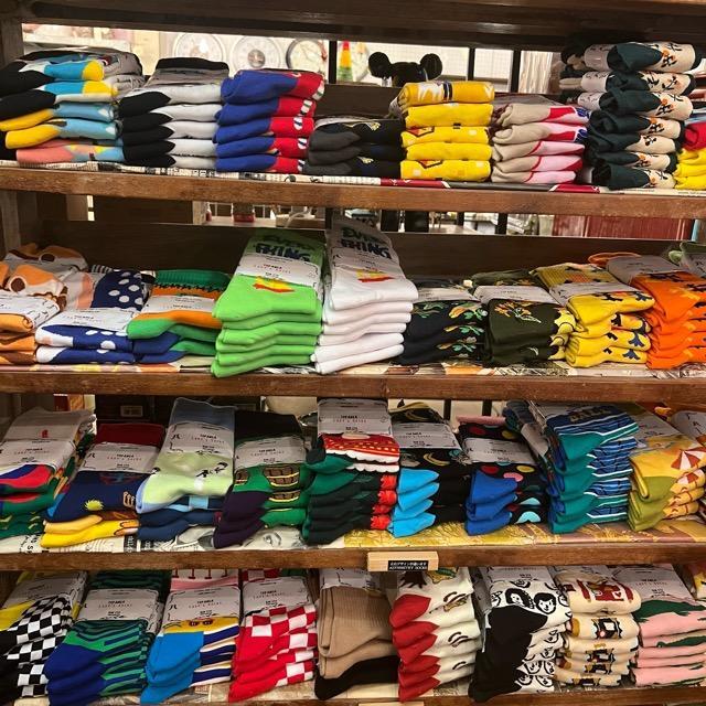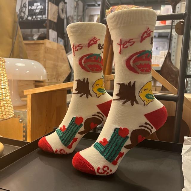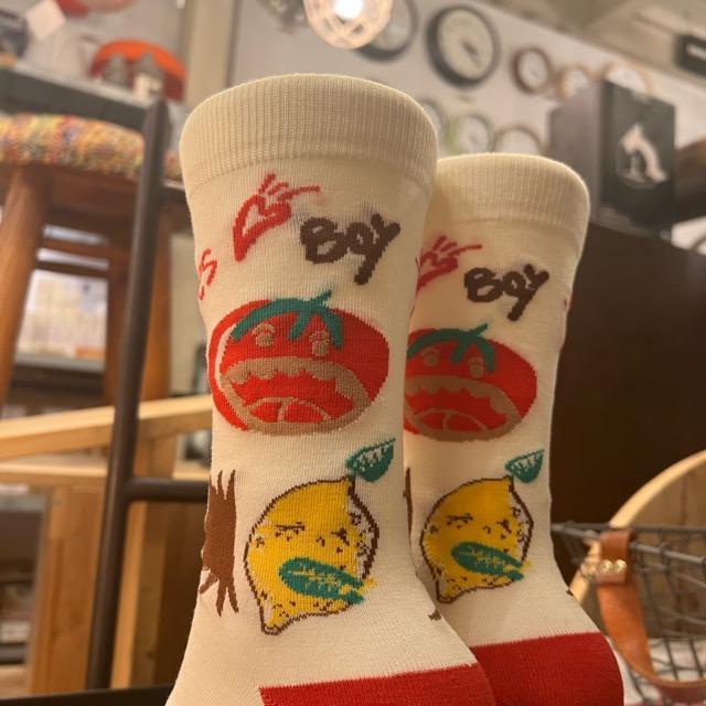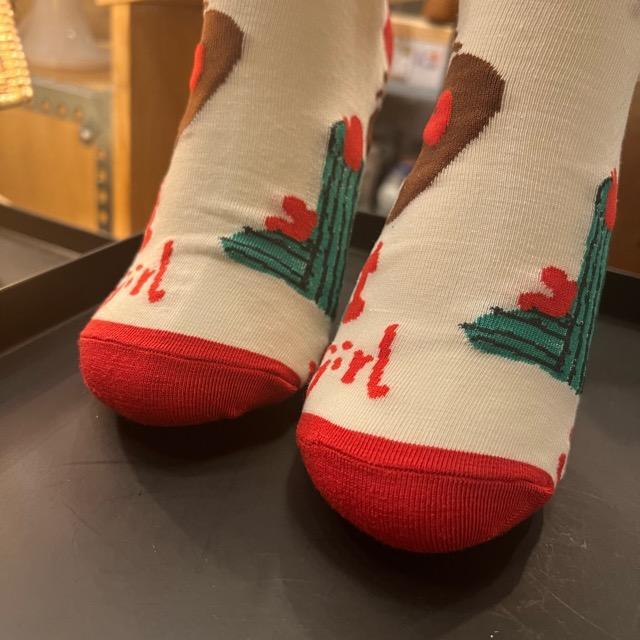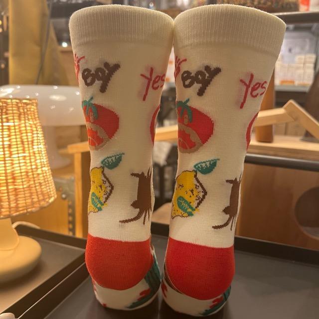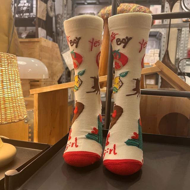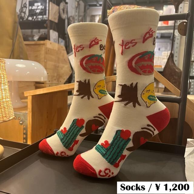 個性豊かなソックスなどの小物を合わせるスタイルを提案しています。