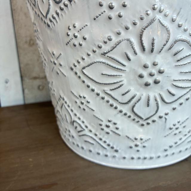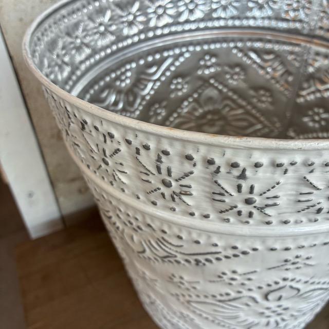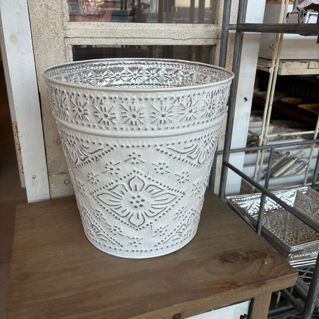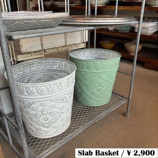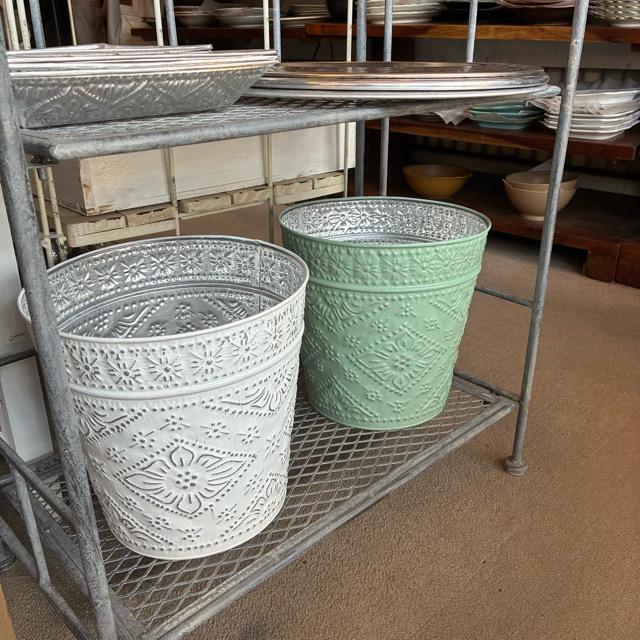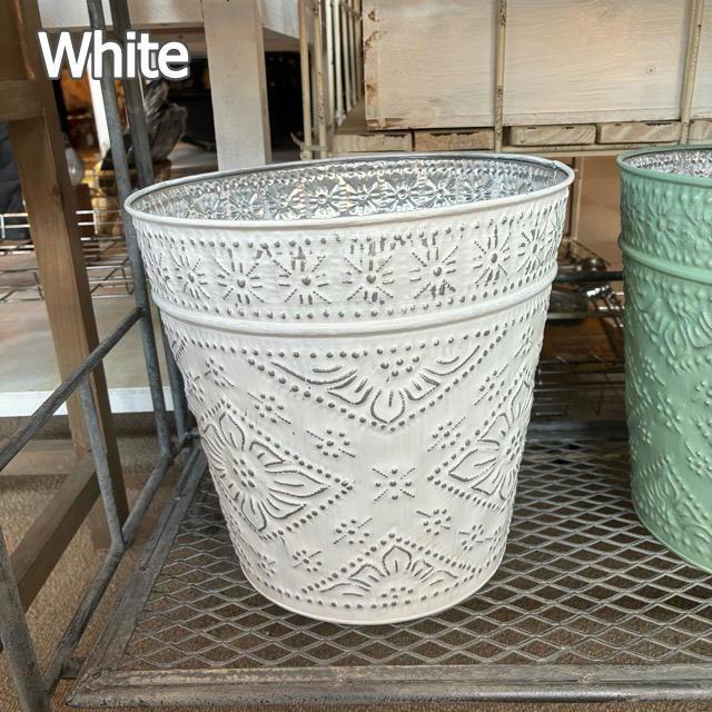 Indonesia Aluminum Slab Basket, 2 Colors, White and Green. Can be used as a trash can, planter cover, or toy storage.