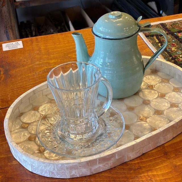 天然のカピスシェルを美しいモザイクタイル状にはめこんだトレイ。