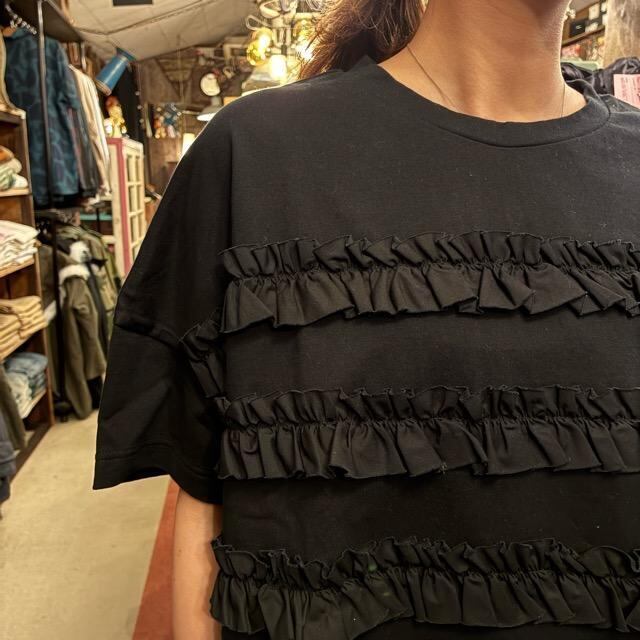UNIVERSAL SEVEN ユニヴァーサルセブン クラシック天竺ボーダーフリルTシャツ クロ ブラック 黒 半袖 カットソー ブラウス コンボ プルオーバー