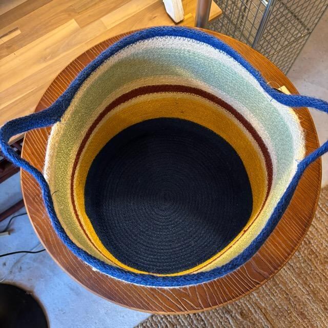 丈夫なジュートでカラフルなバスケットになります。