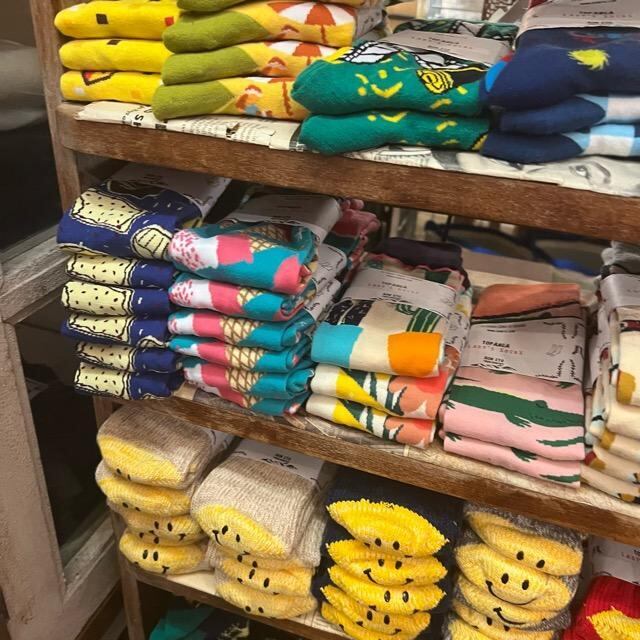 個性豊かなソックスなどの小物を合わせるスタイルを提案しています。
