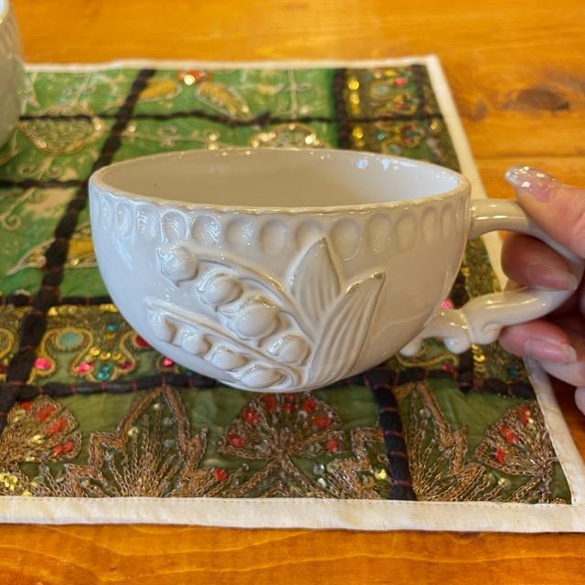 縁にあしらわれた繊細なスズランは、手に取るたびに心をふっとほどいてくれるよう。