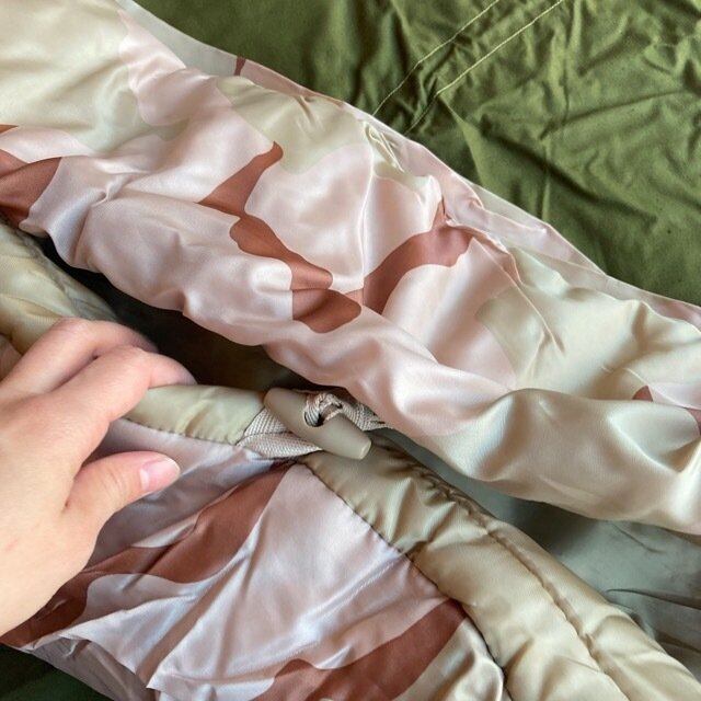 足元から巻き上げていき、フード外側のカバーに入れるとそのまま収納できます。