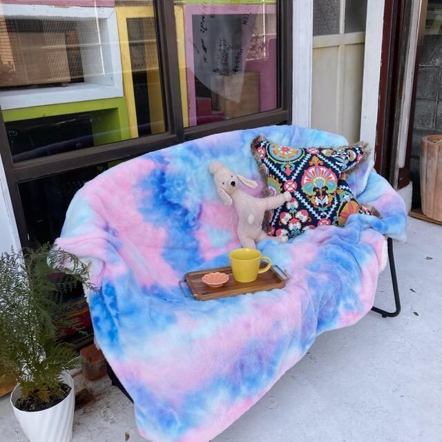 タイダイ染めのカラフルな色合いが目を惹くブランケット。