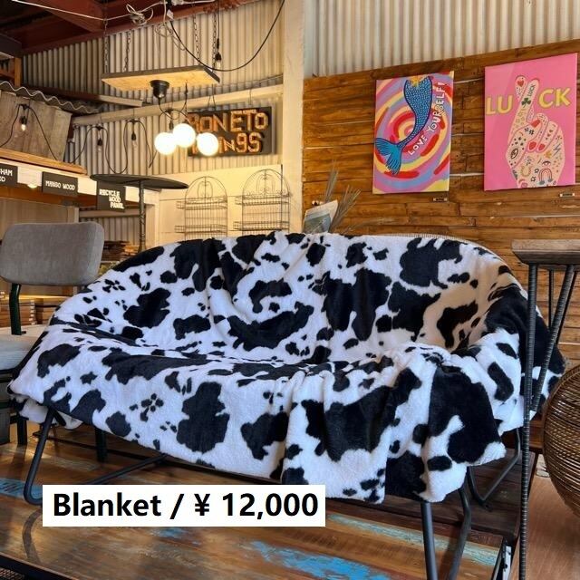 ウシ柄で埋め尽くされたフリース素材のブランケット。