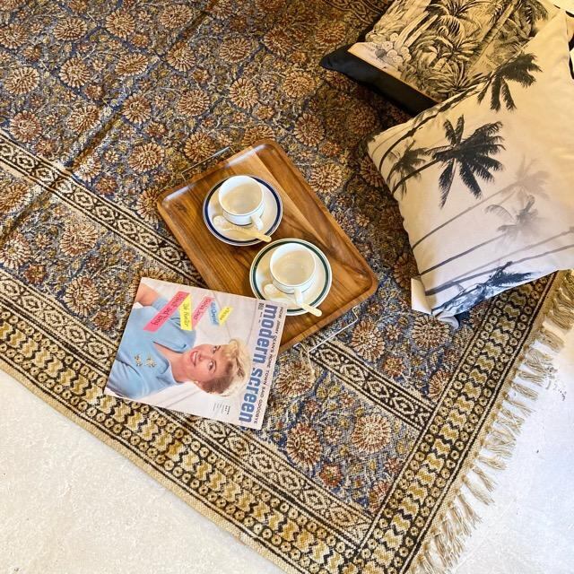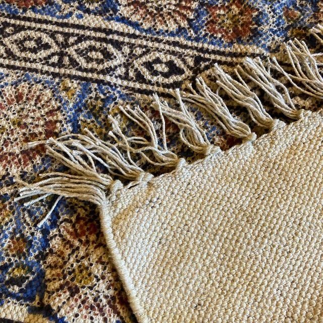 インド ブロックプリントラグマット 120×180cm ブルー カーペット ソファ コットン 綿 花柄 フラワー 2人掛けソファ トライバル ボタニカル