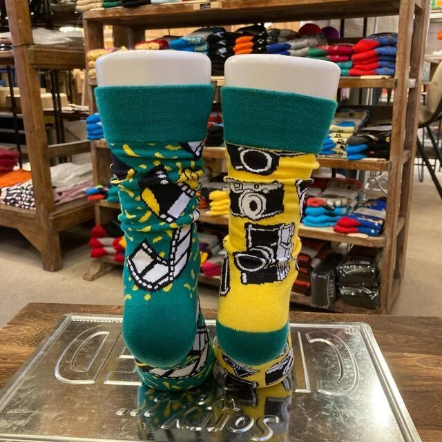 TOPANGA SOCKS Lady's アシンメトリーソックス カメラとフィルム グリーン イエロー ファッション レディース 靴下 ユニーク プチギフト