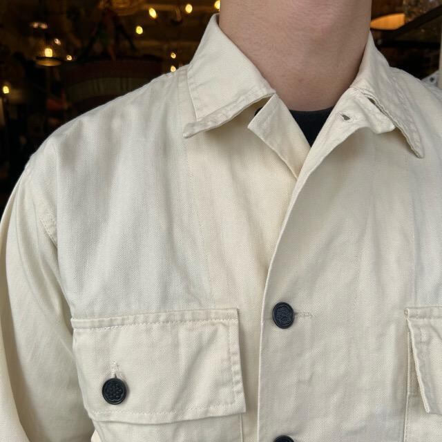 こちらは、USミリタリーを代表する「M43 HBTジャケット」のナチュラルカラータイプです。1940年代のアメリカ軍で採用されたM43ジャケットは、実用性と耐久性に優れたデザインで、今もなお多くのファンに愛され続けています。このナチュラルカラーは、カジュアルながらも上品で、あらゆるシーンで活躍する万能な一着です。