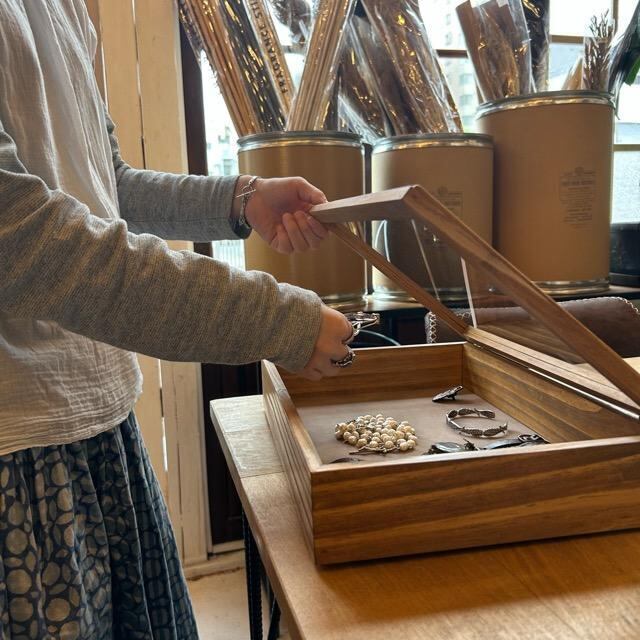 蓋がガラス面になっているため、中身が一目で分かり、お店にいるような感覚でアクセサリー選びが楽しめます。