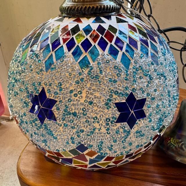 球体型のpシェードにタイルのようなガラスパーツやビーズを散りばめられたカラフルな1灯ライト。
